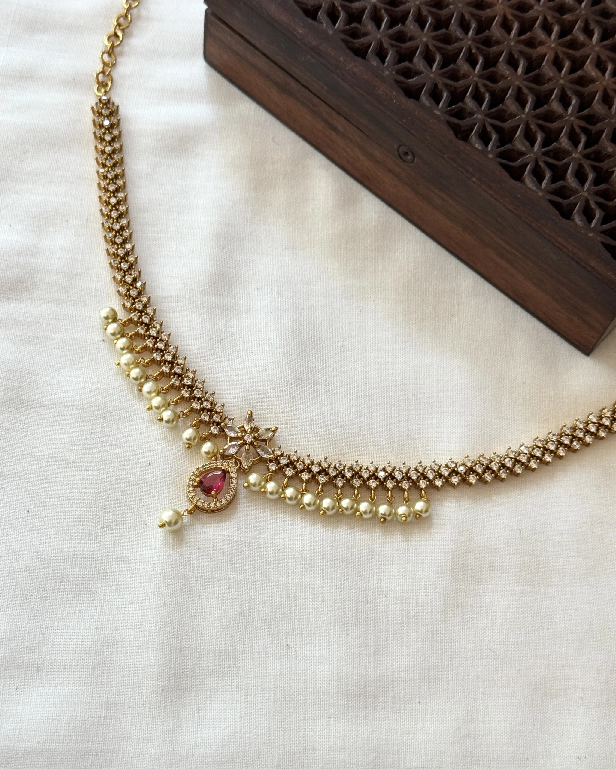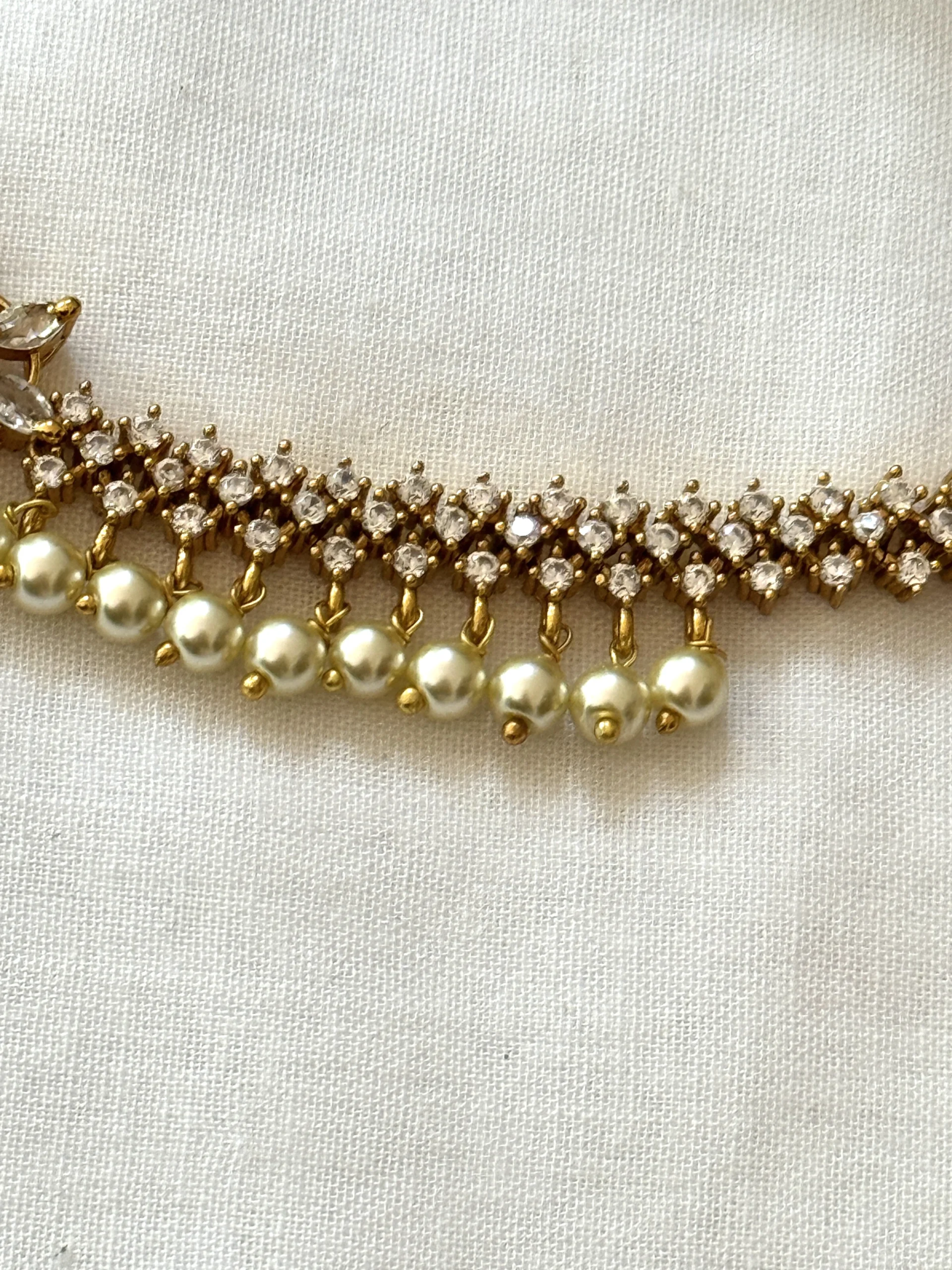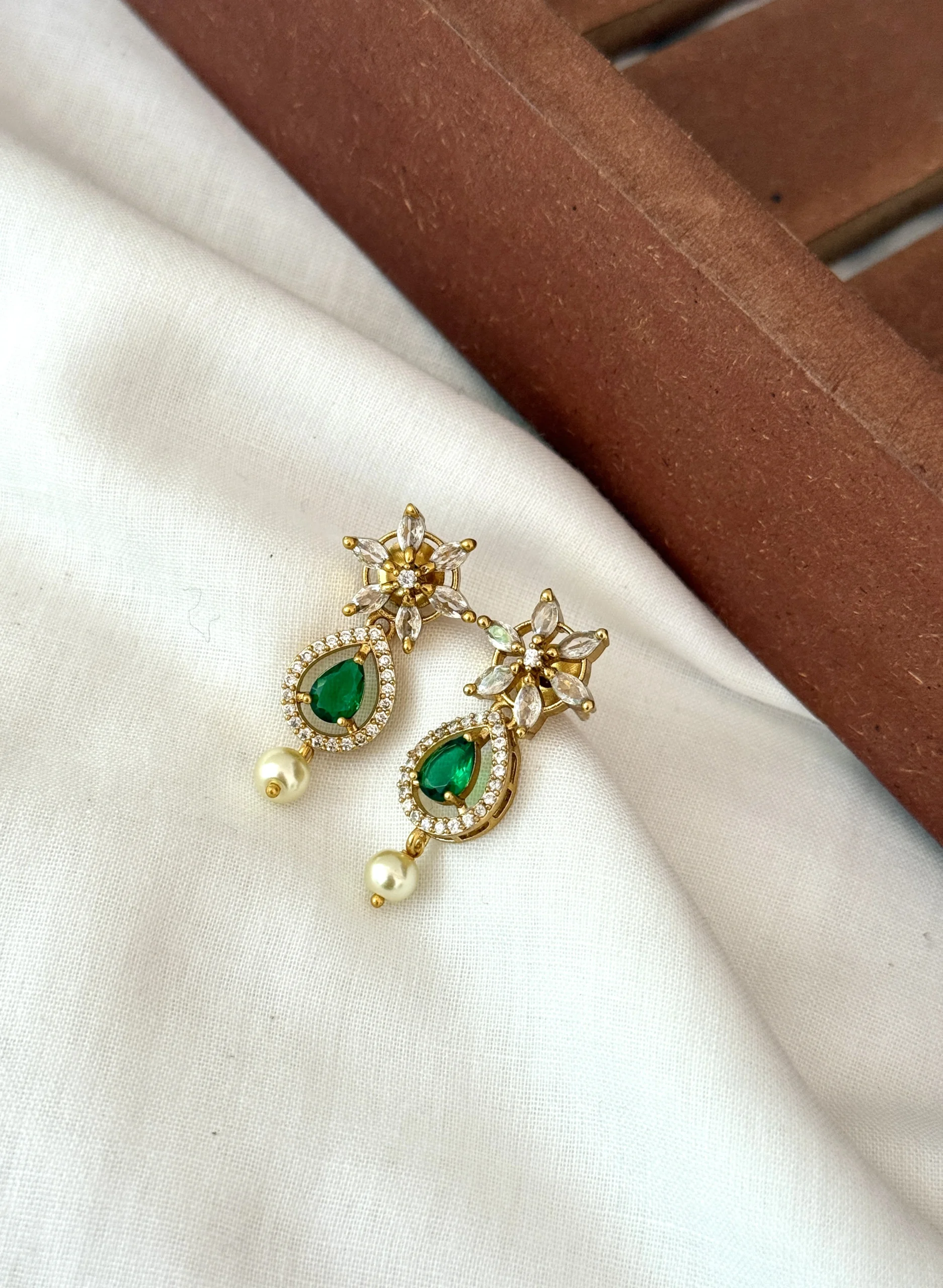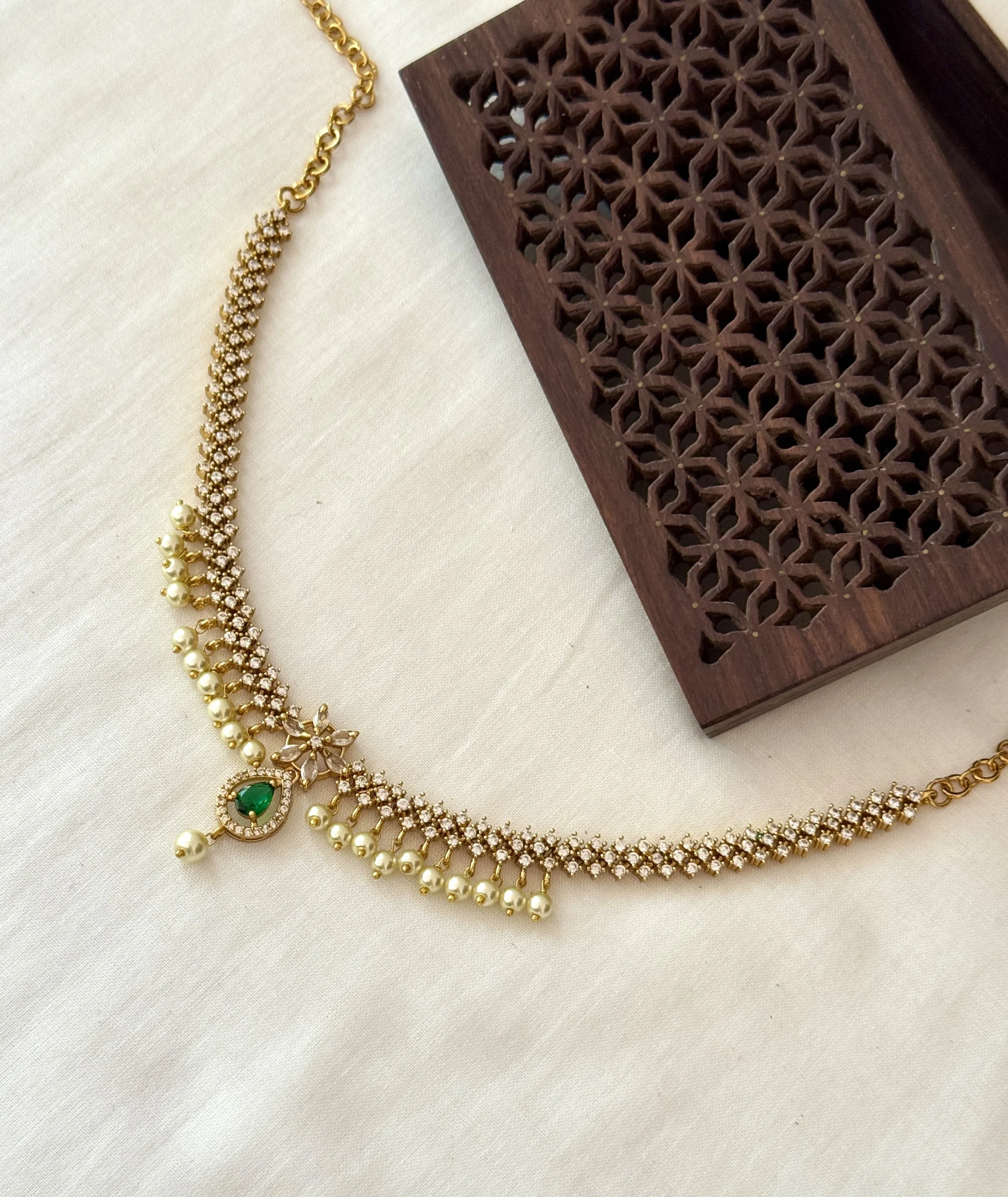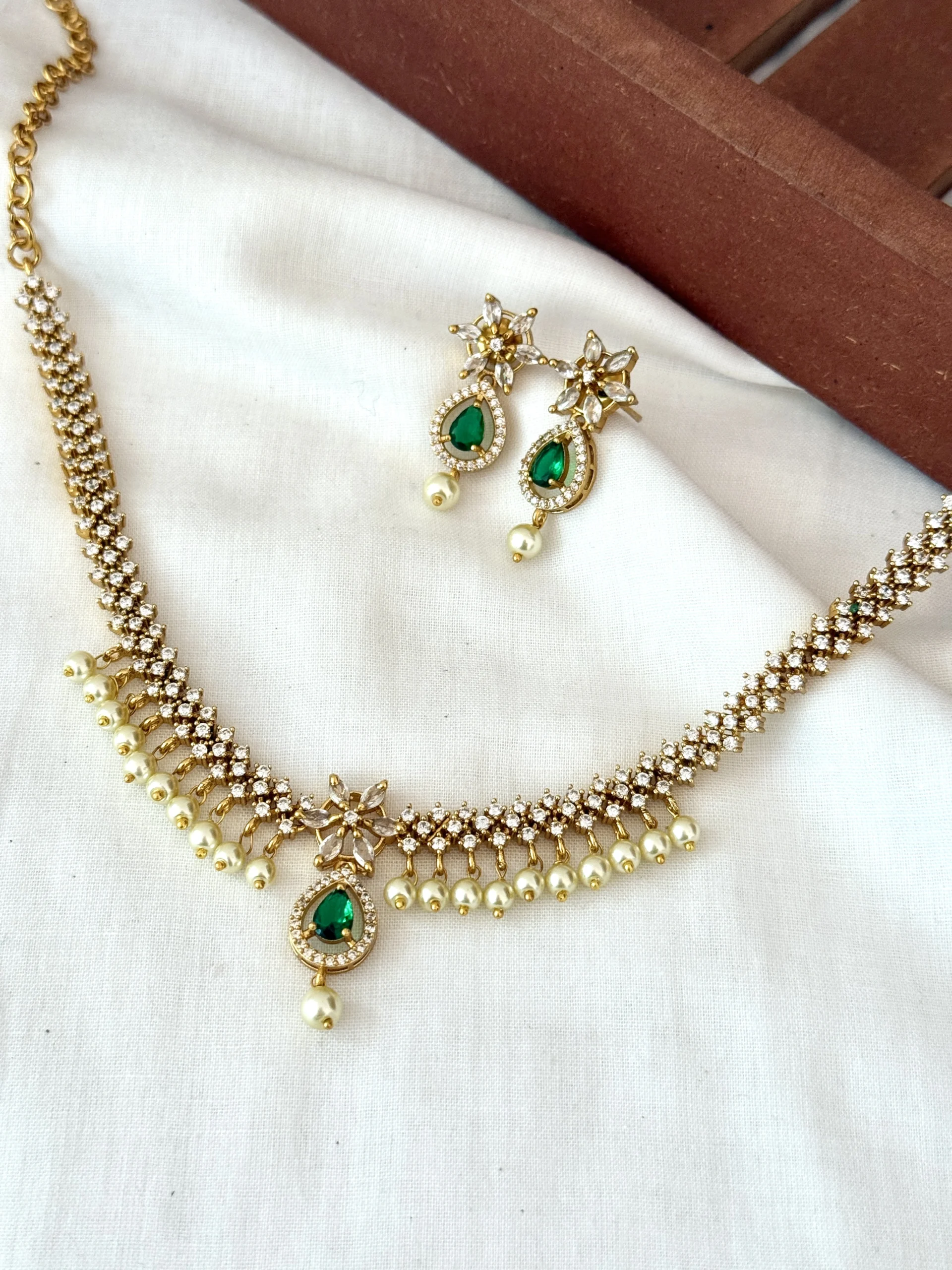 Elegant gold-tone necklace set featuring sparkling stones, rich green teardrop accents, delicate floral motifs, and pearl drops. A graceful blend of tradition and charm—perfect for festive and wedding wear