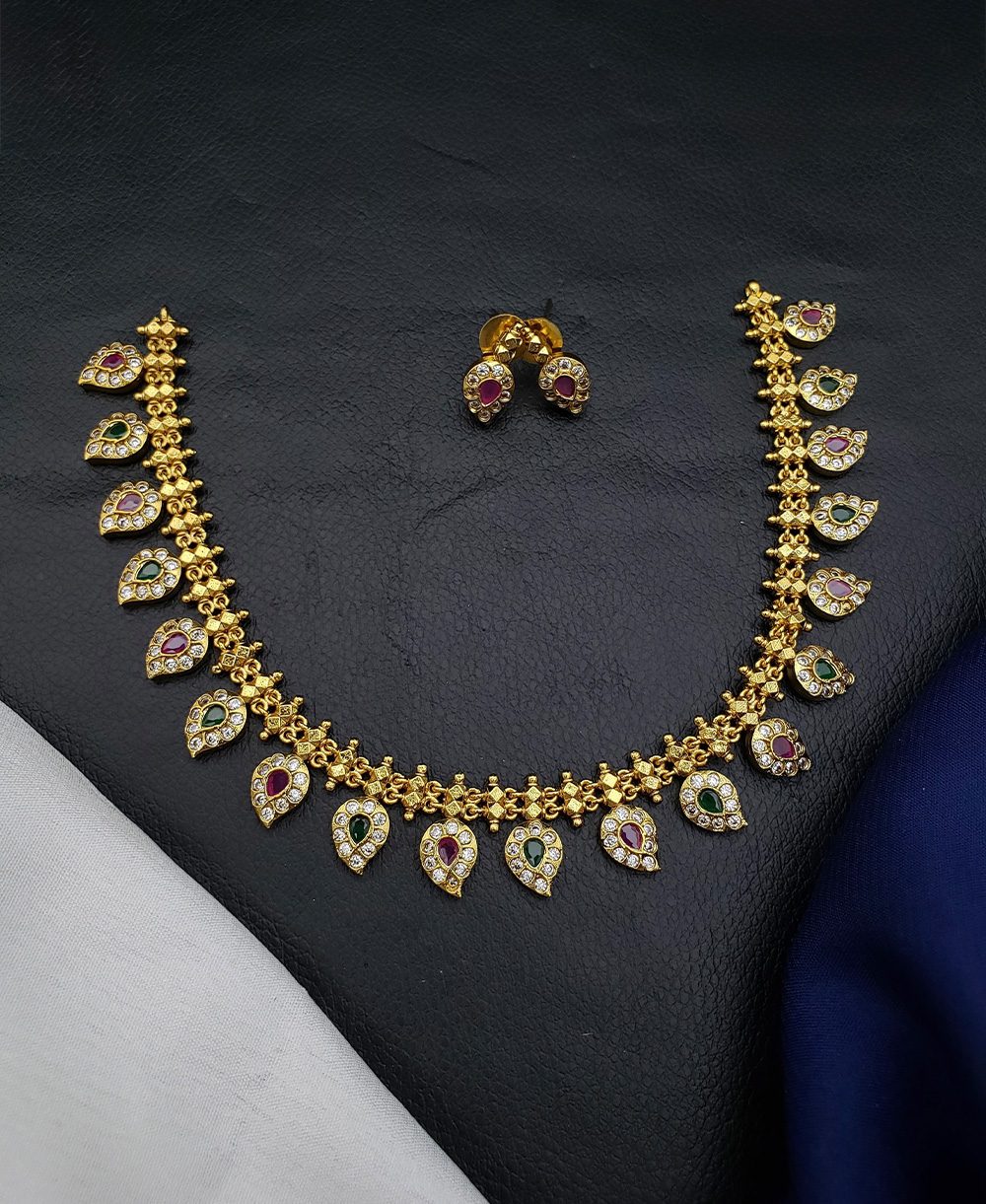 An elegant necklace set featuring a delicate floral-link chain adorned with mango shaped motifs, embellished with green and pink stones and sparkling accents. Paired with matching stud earrings, it has a classic, traditional look perfect for festive or wedding wear