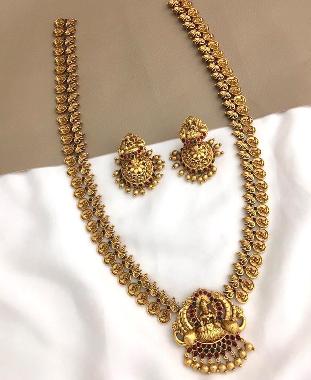 Traditional temple-style necklace set crafted in an antique gold finish, featuring a detailed goddess Lakshmi pendant with red stone accents, paired with matching jhumka earrings. A classic, divine design