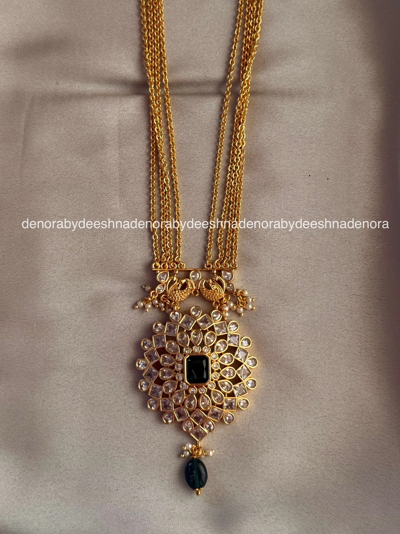 multi layer long chain with premium white stone pendant and green beads
