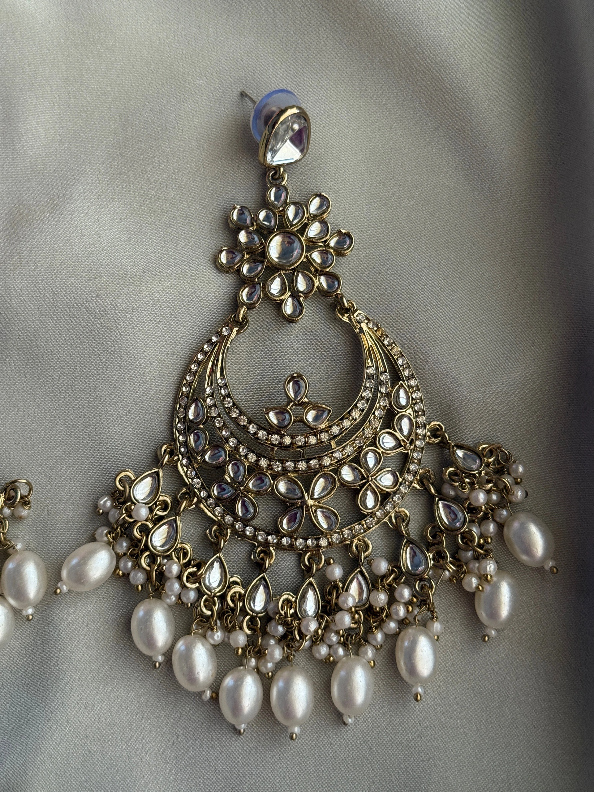 Traditional chaandbali Kundan earrings featuring intricate gold-toned detailing, embellished with shimmering white stones and finished with elegant pearl drops. A classic statement piece perfect for weddings and festive occasions.
