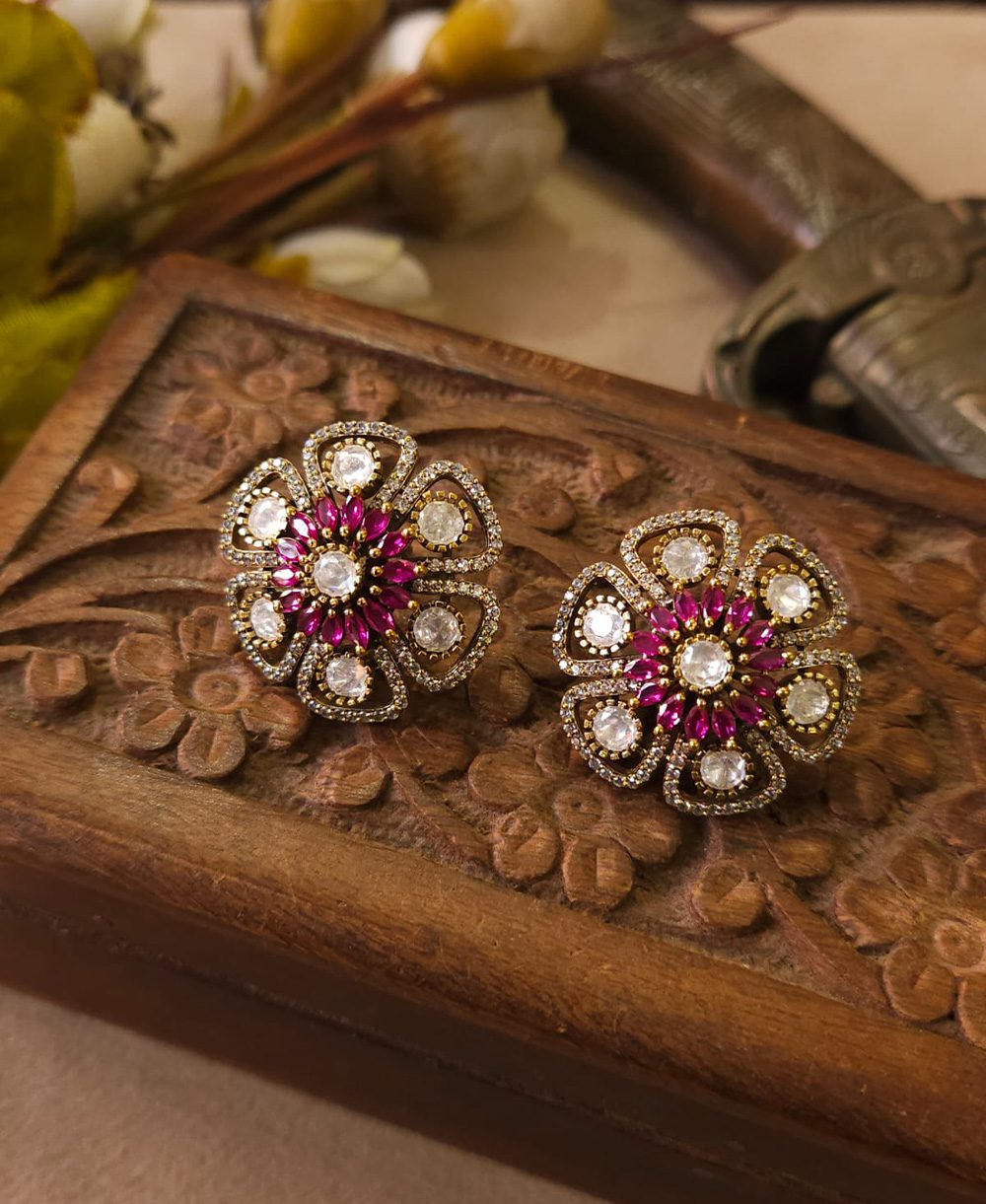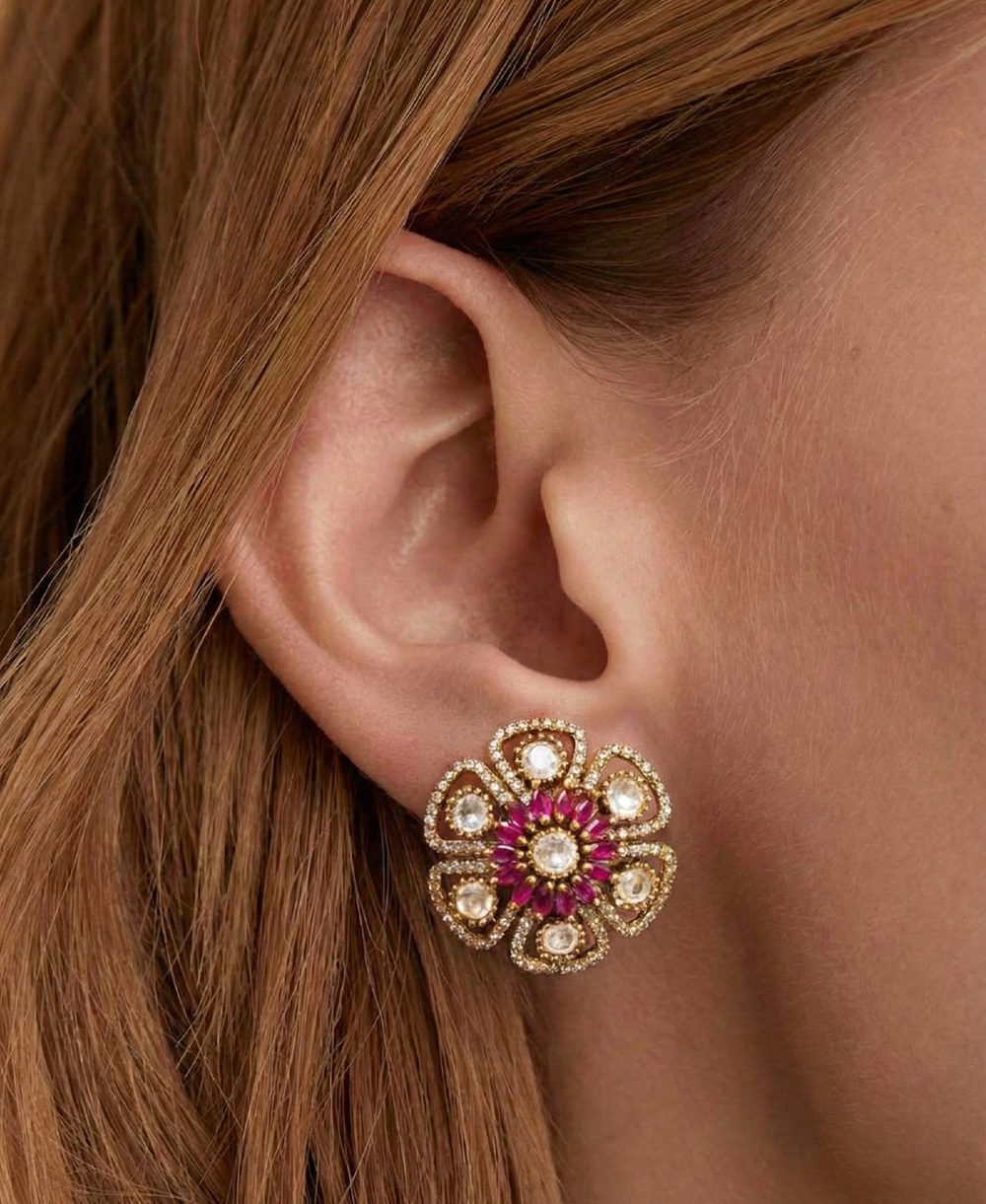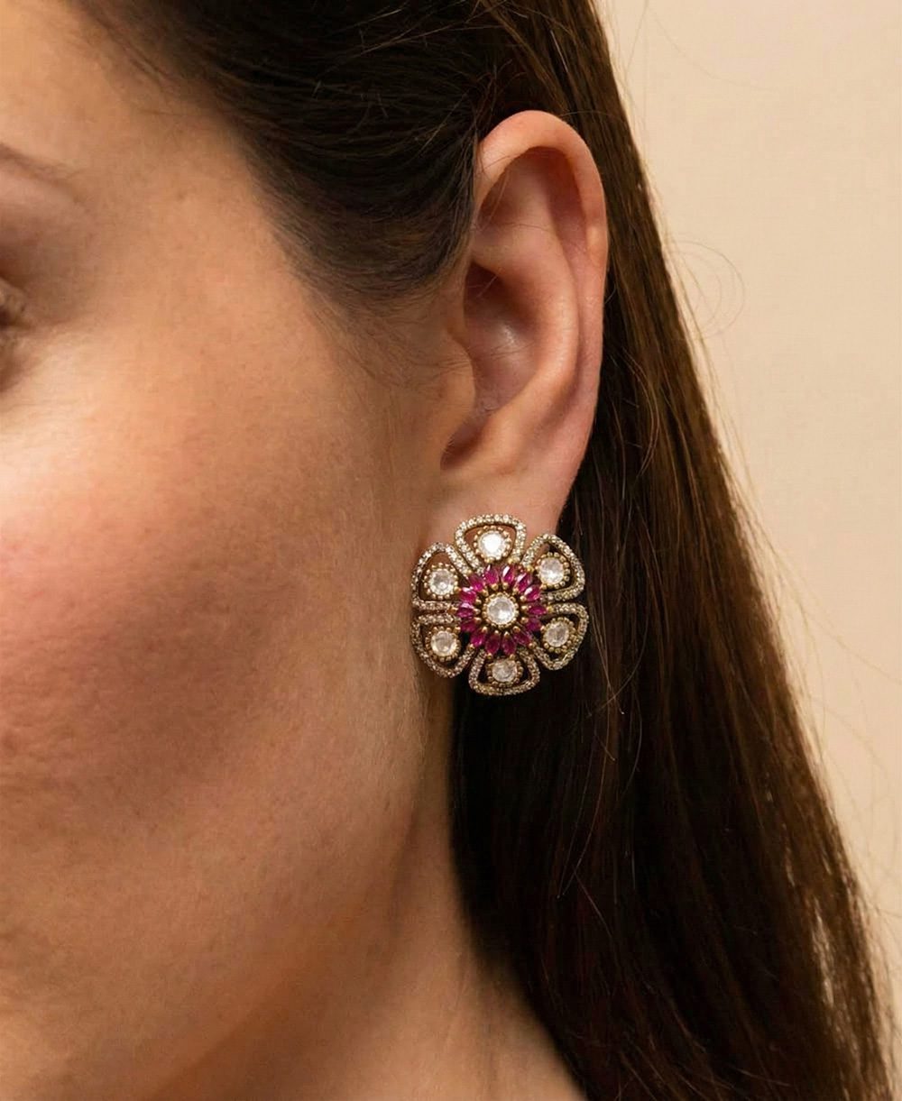 Exquisite floral stud polki earrings crafted in a beautiful design, featuring sparkling white stones encircling vibrant pink accents. A timeless, elegant piece perfect for festive and special occasions.