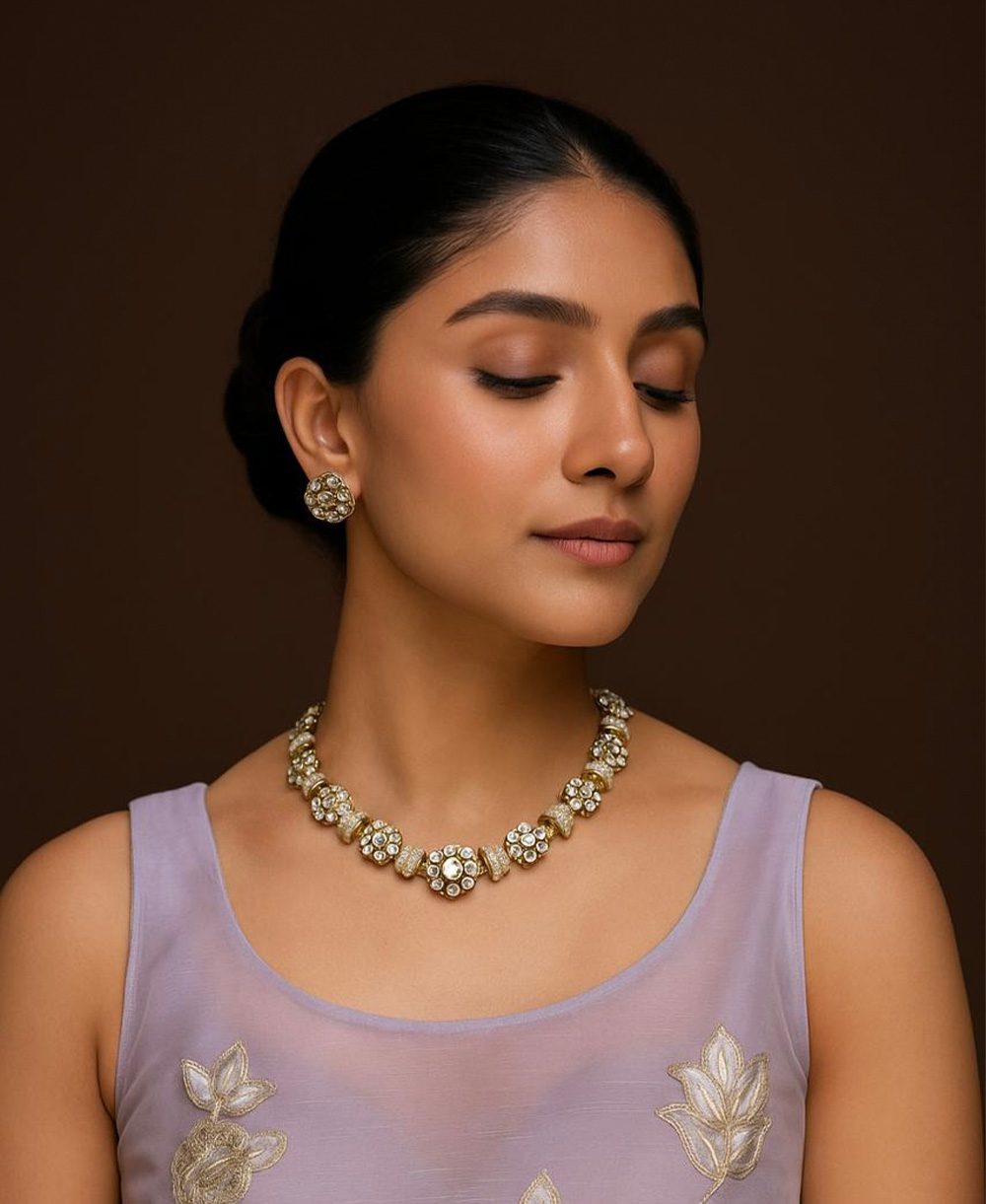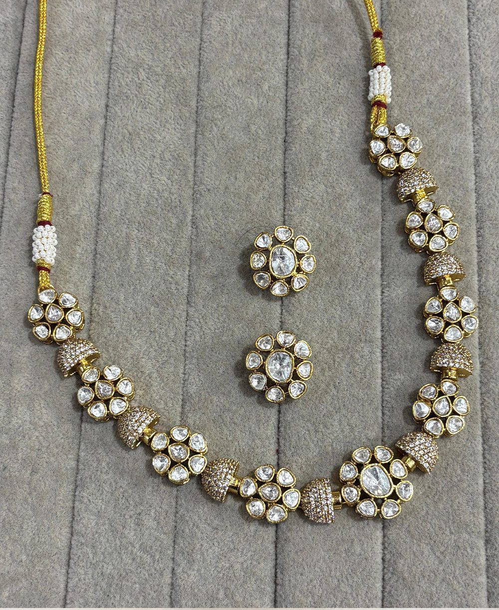 Elegant traditional polki necklace set featuring floral clusters of shimmering white stones in a gold-toned finish, paired with matching stud earrings. A refined, timeless design ideal for weddings and festive occasions.