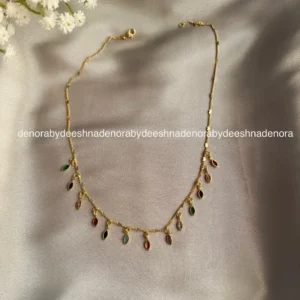 An elegant gold-tone necklace featuring intricate traditional motifs, adorned with ruby-pink and emerald-green stones, finished with delicate pearl drops. Perfect for weddings, festive occasions, and ethnic wear.